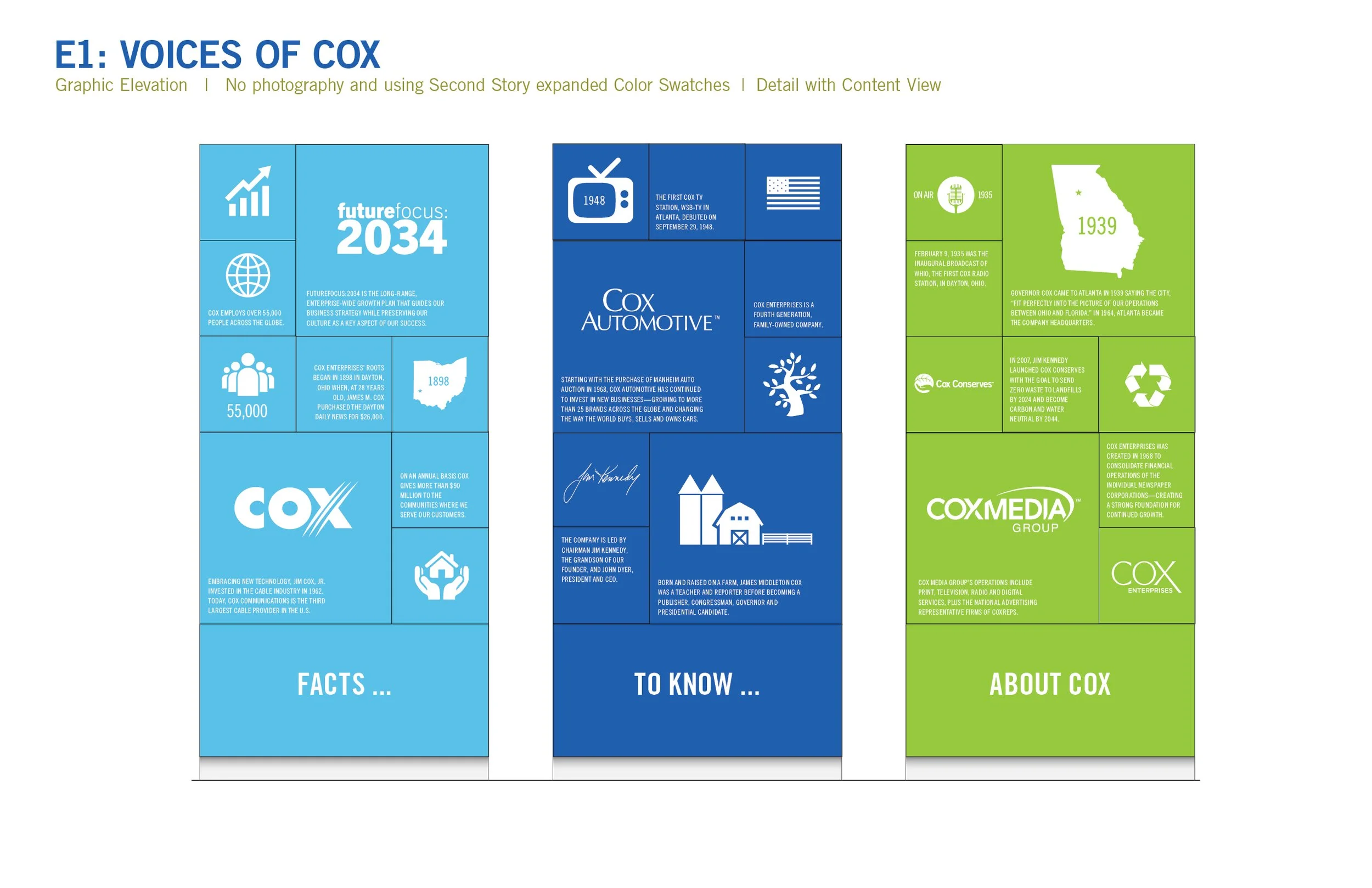 Located on the campus of Cox Headquarters, the Cox Discovery Center celebrates the history, successes, and values of the Cox family, companies, and employees that constitute Cox Enterprises, a leading communication, media, technology, and automotive services company. Intended to inspire Cox employees, partners, and community members. Elegant branded graphics and interactive exhibits highlight the history of Cox and the company’s future.